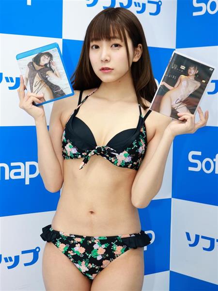 1メートル61、B80W57H82のスレンダーボディーを黒の水着に包み、笑顔でDVDを紹介した辰巳。8月に山梨・河口湖で撮影され、疲れている彼のために一緒に旅行に出か、癒やしてあげるという内容だ。